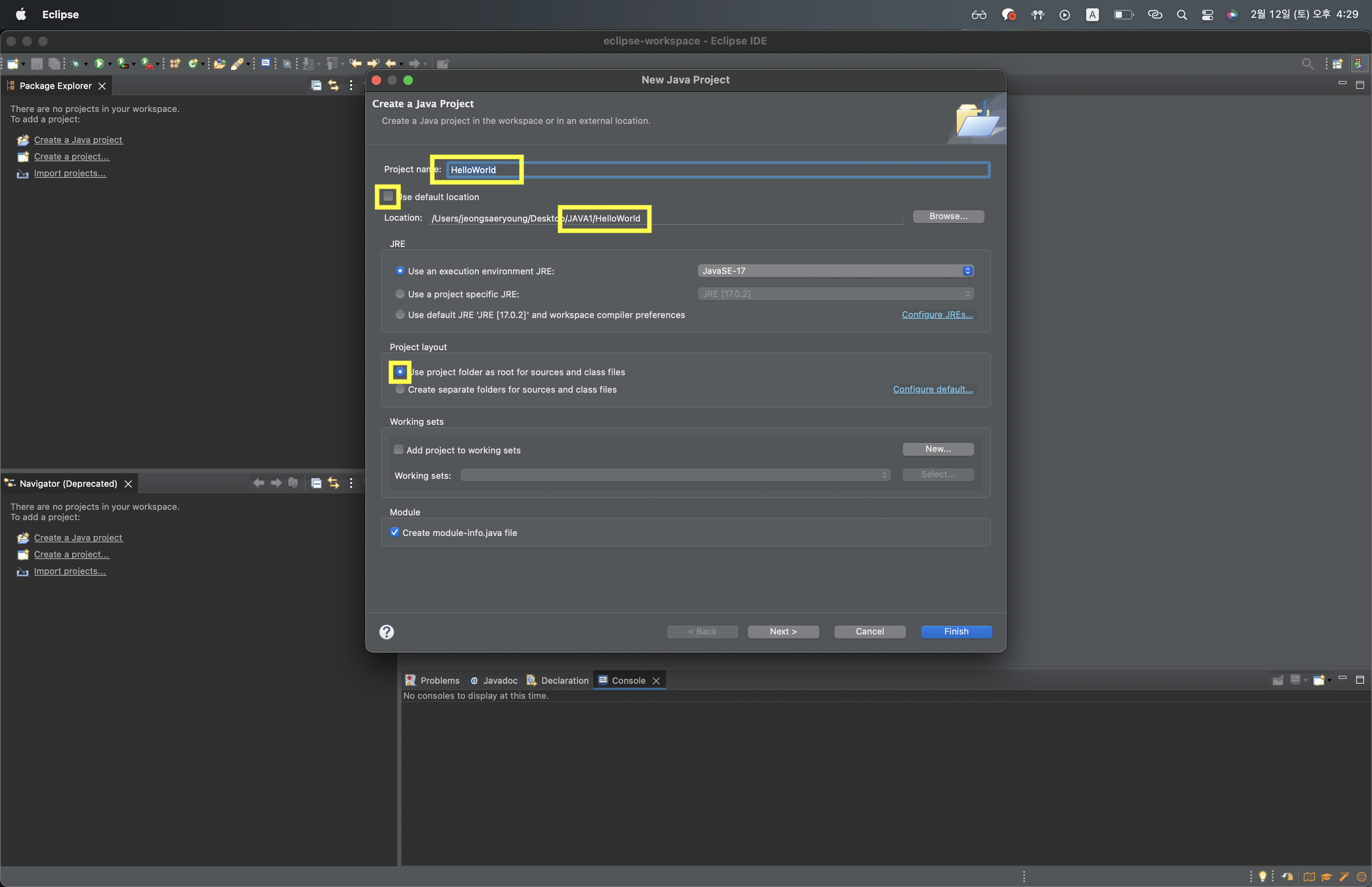 저는 미리 만들어놓은 JAVA1이라는 폴더로 지정해주고 /HelloWorld라고 직접 적어주었습니다.