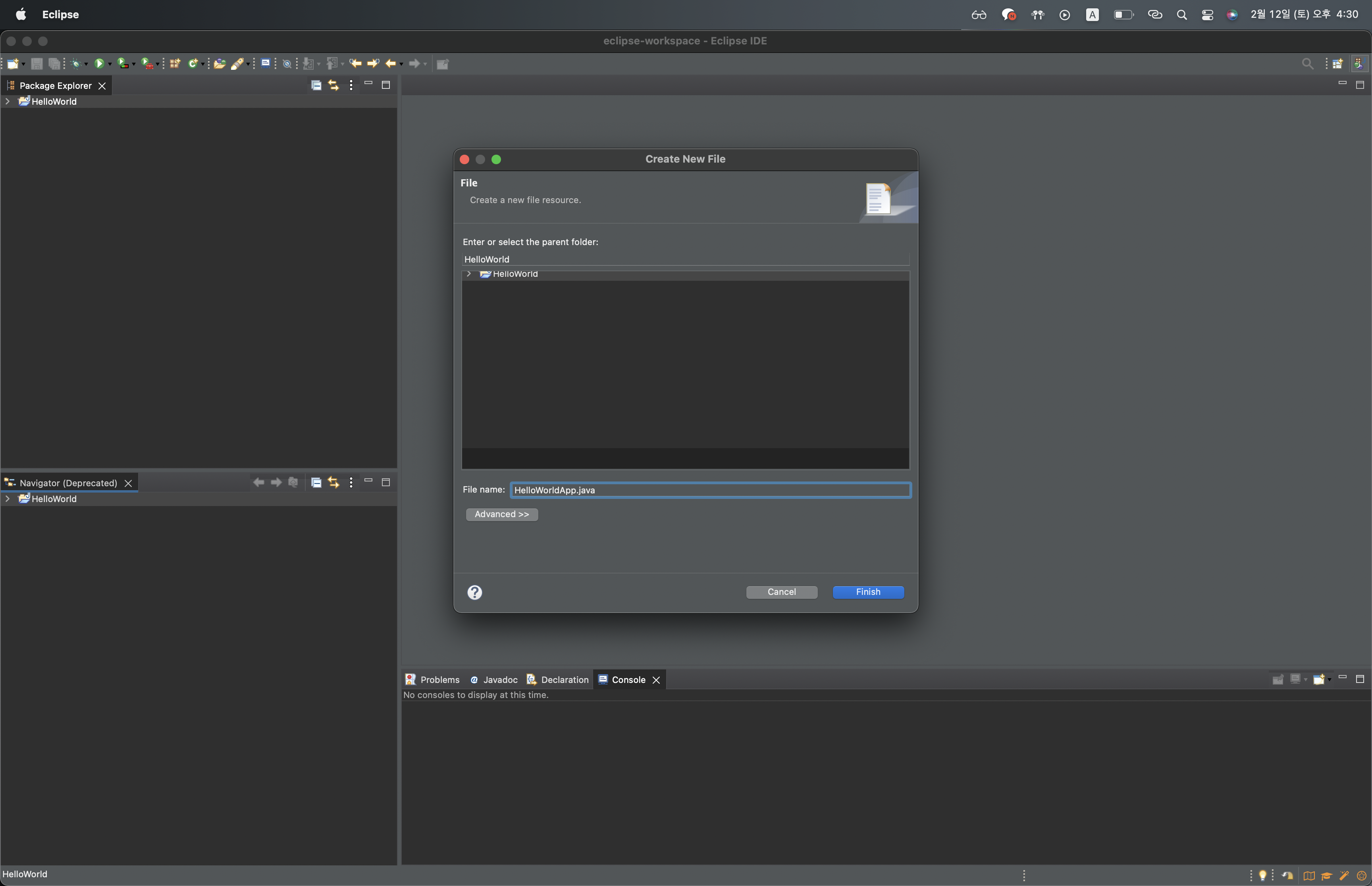파일명으로 HelloWorldApp.java를 적어주고 finish를 클릭해서 파일 생성을 완료합니다.