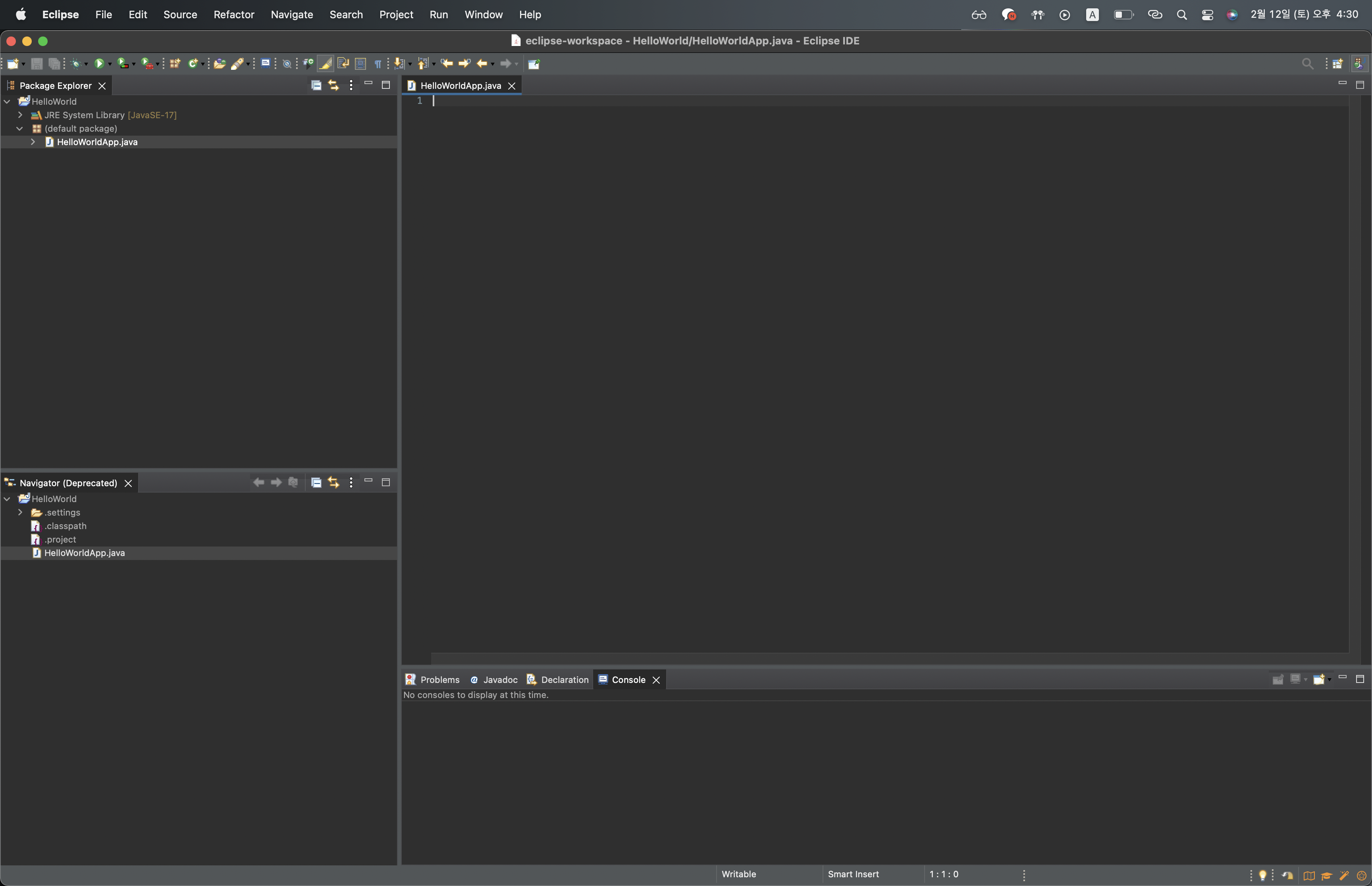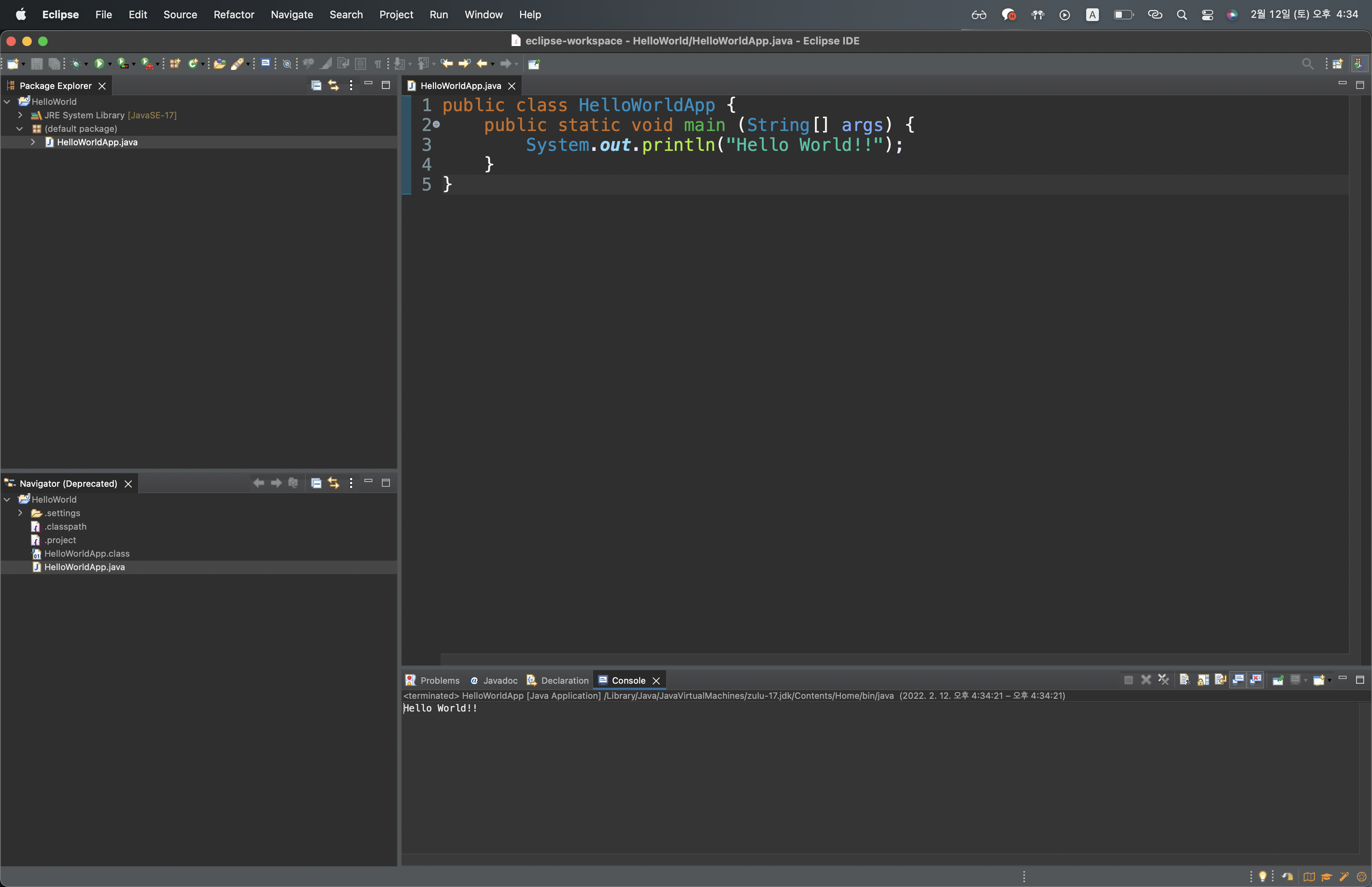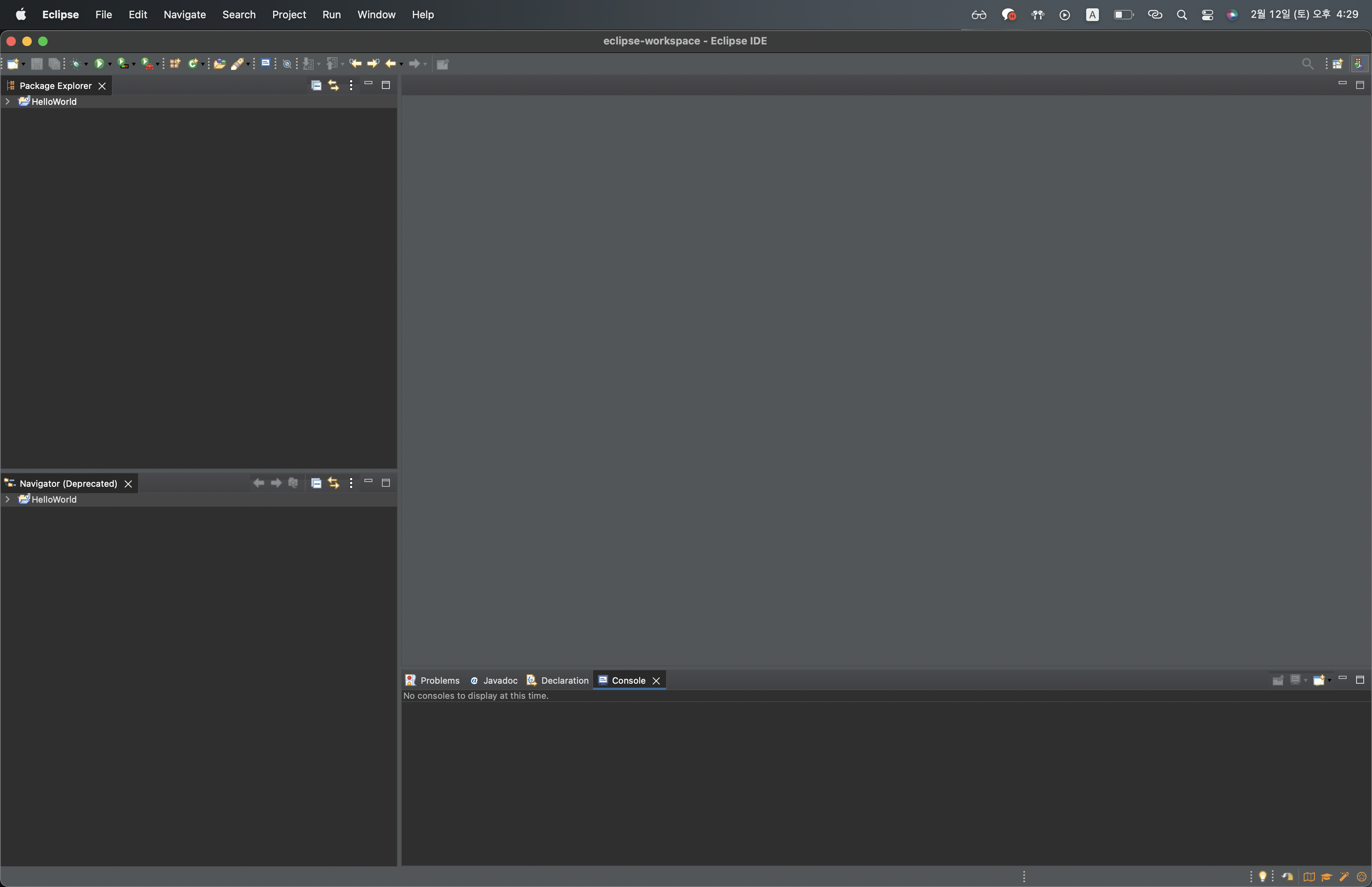 처음에 세팅되어 있는 Package Explorer는 조금 더 자바에 익숙해진 후에는 사용하기 편하지만, 처음에는 Navigator를 통해 파일을 확인하는 것이 편하기 때문에 사용해줍니다.