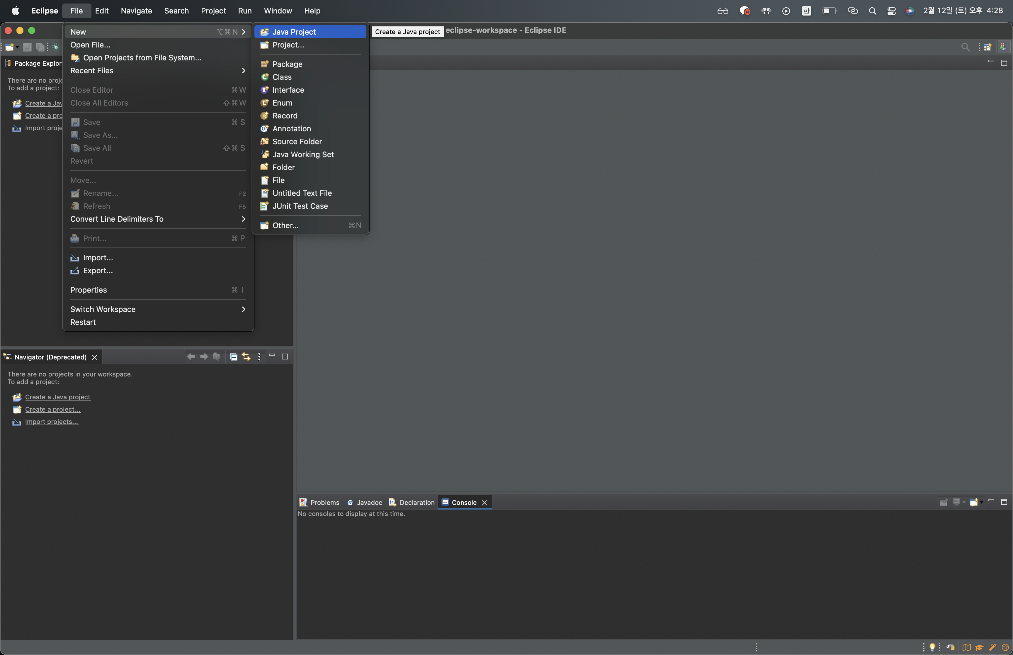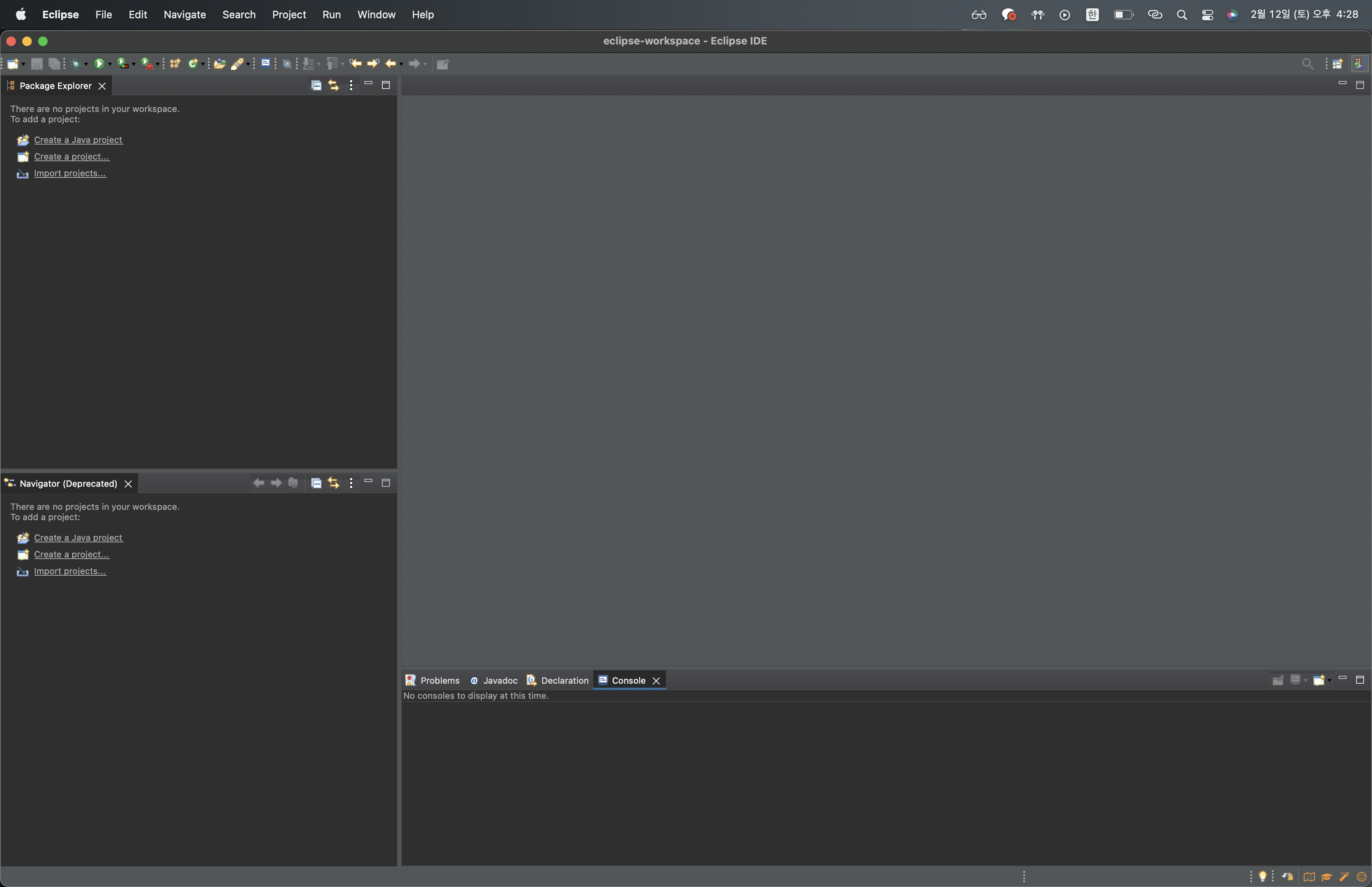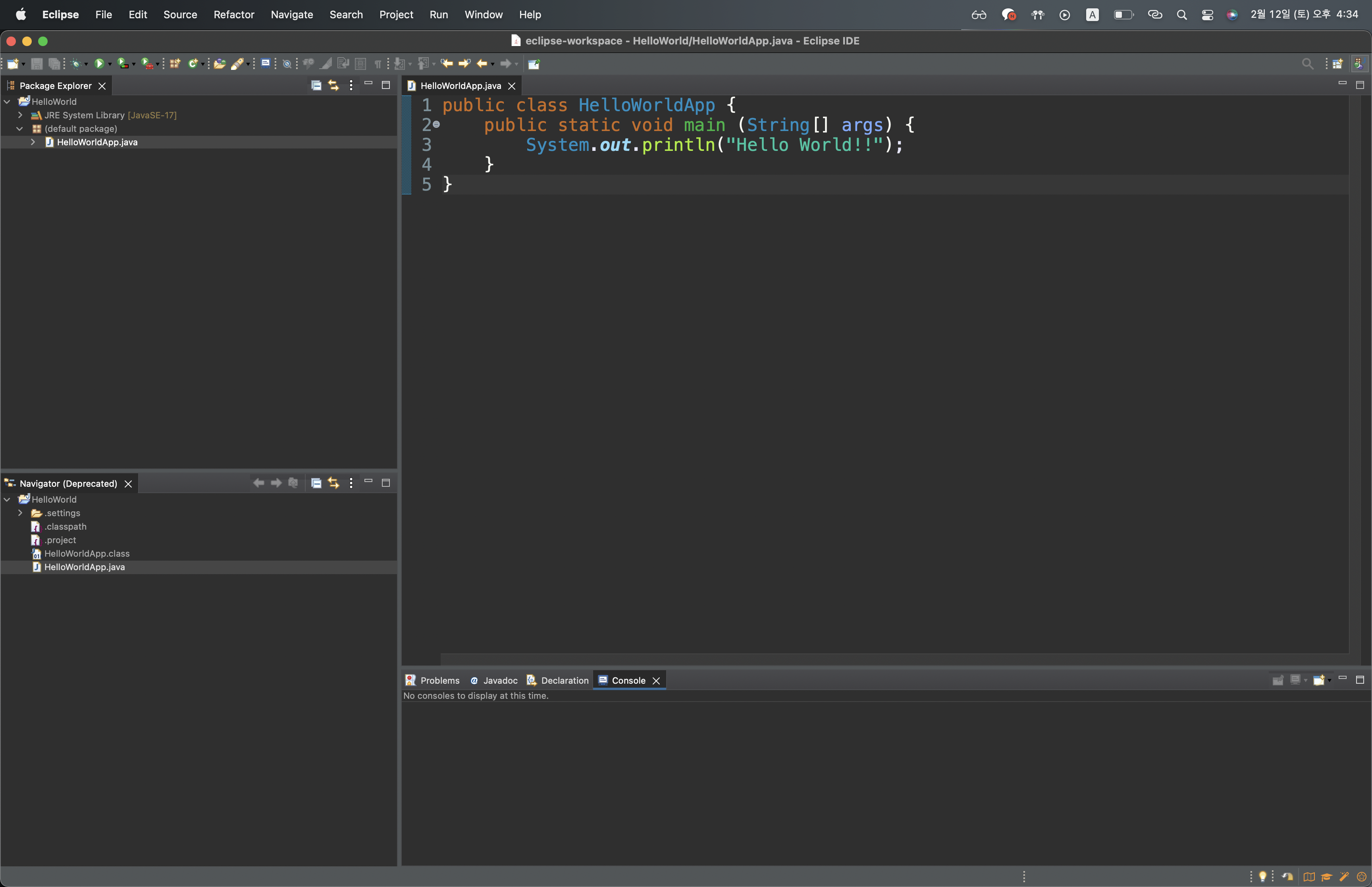 처음에 세팅되어 있는 Package Explorer는 조금 더 자바에 익숙해진 후에는 사용하기 편하지만, 처음에는 Navigator를 통해 파일을 확인하는 것이 편하기 때문에 사용해줍니다.