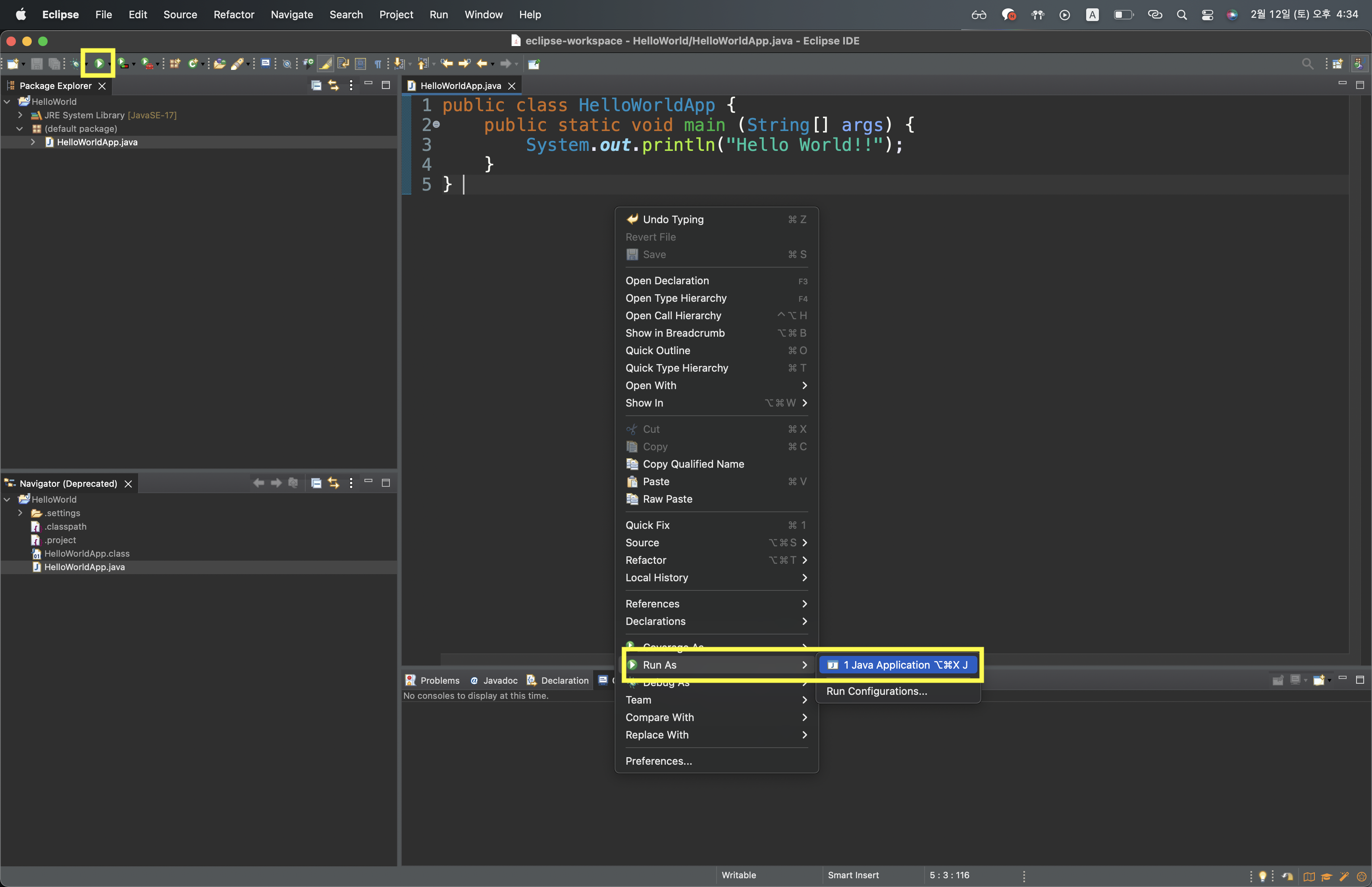 빈 공간에 우클릭을 한 뒤, Run As를 통해 실행시키는 것과 위쪽에 초록색 실행 아이콘을 클릭해주는 것이 있습니다.