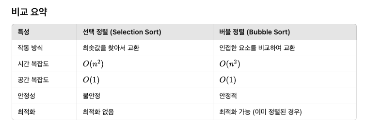 - 최적화 가능성: 만약 배열이 이미 정렬되어 있다면, 한 번의 패스만으로 정렬이 완료되므로 성능이 향상될 수 있음.