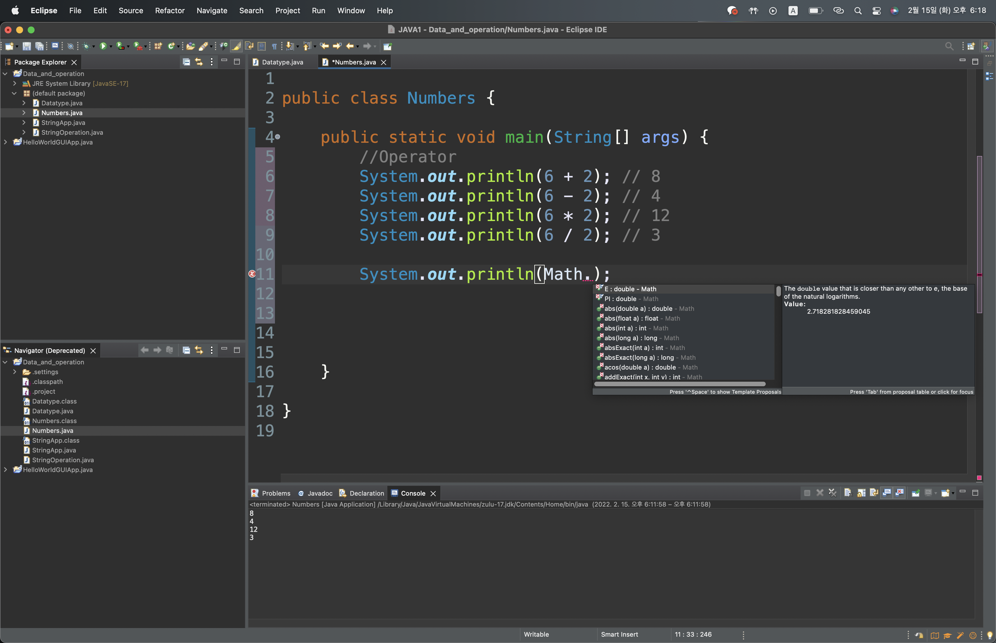 system.out.println(Math.)라고 코딩 창에 적어주면 다양한 연산자들이 화면에 보입니다.